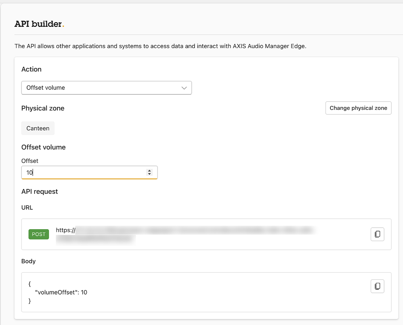 API builder — A built-in tool that assists in building API requests. This tool simplifies the process of crafting the required JSON by helping you select the correct IDs and avoiding common errors such as typos, missing parentheses, or incorrect syntax. See AXIS Audio Manager Edge API