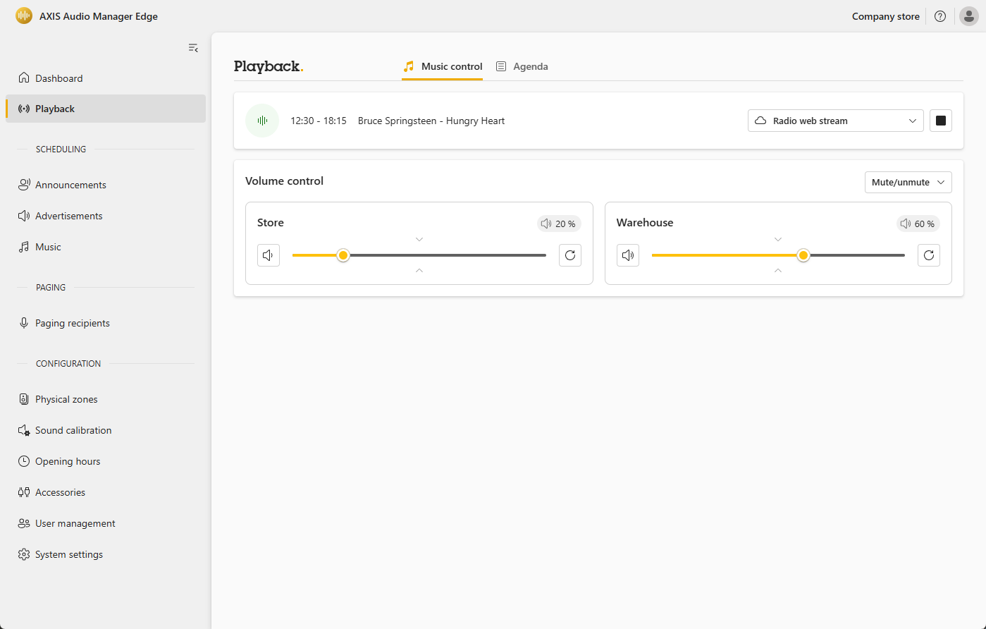 Music volumes is now called Playback. This page also shows the agenda of currently playing and upcoming content.